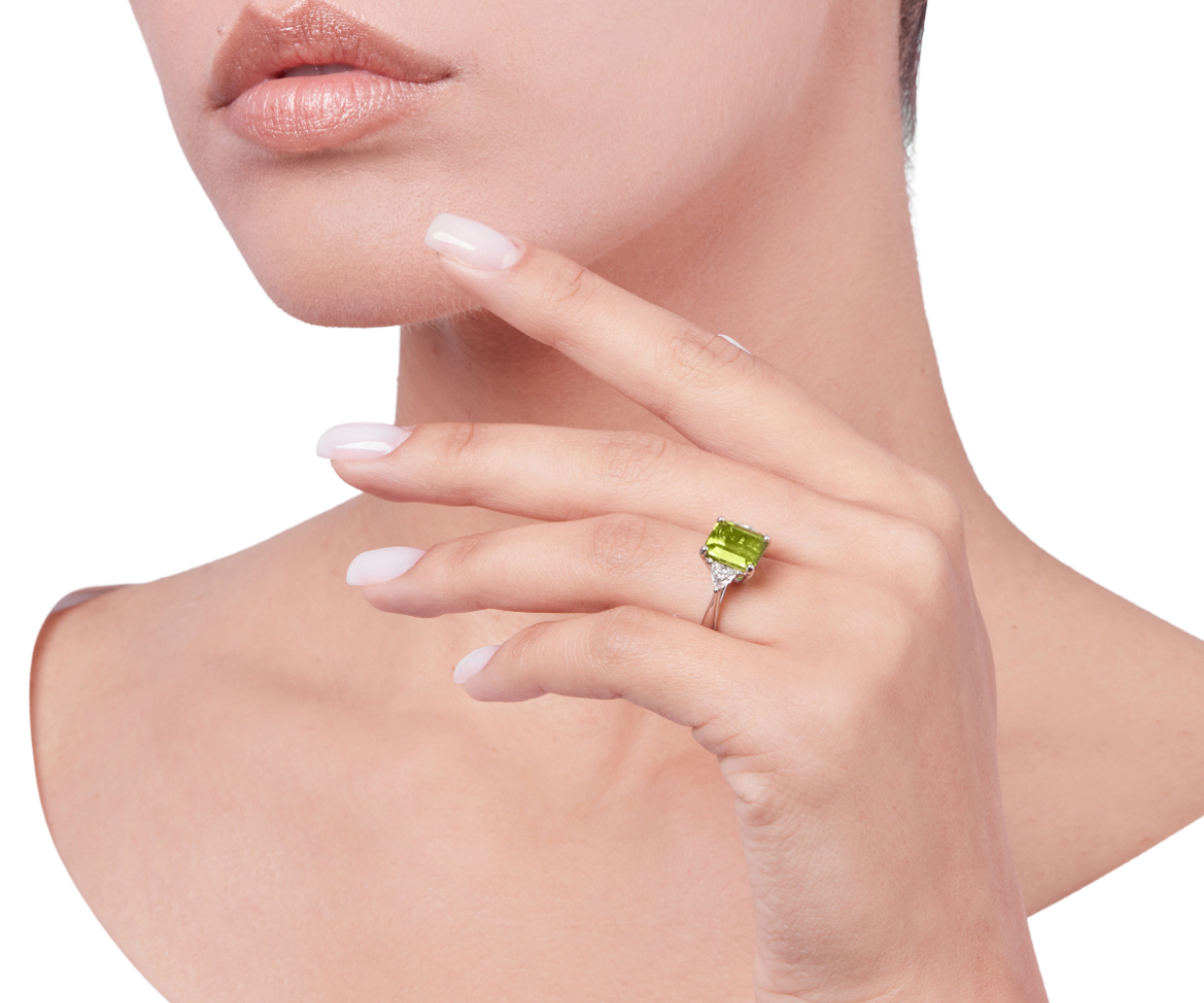 Elegant, inelul CASIANI TRIAD realizat in aur alb de 18k prezinta ca si piatra centrala un peridot cu taietura octogon si doua diamante in lateralele acestuia. O bijuterie clasica si un simbol al luxului discret.